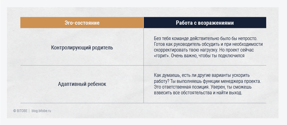 Сотрудник 3 реагирует с позиции «взрослого». В отличие от двух своих коллег он сразу предлагает альтернативное решение, которое приводит к выполнению поставленной задачи. Это устроит обе стороны, и на этом разговор будет окончен, чего нельзя сказать про другие кейсы. Там потребуется поработать с возражениями, учитывая эго-состояния сотрудников.