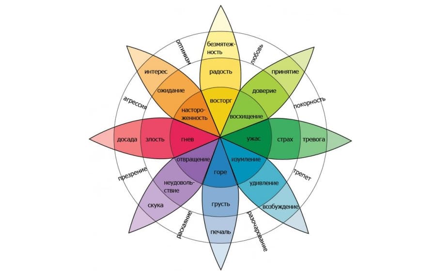 Американский профессор психологии Роберт Плутчик в 1980 году придумал концепцию, в которой обозначил восемь основных видов эмоций (на картинке они находятся в центре) и связанные с ними производные. Он также подчеркнул, что эмоция состоит из трёх компонентов: