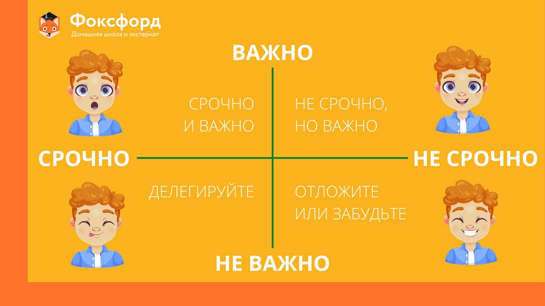 После этого распределите задачи по приоритету: что нужно сделать срочно, а что может немного подождать. Для этого начертите большой квадрат, как на картинке, и перенесите задачи в подходящие блоки.