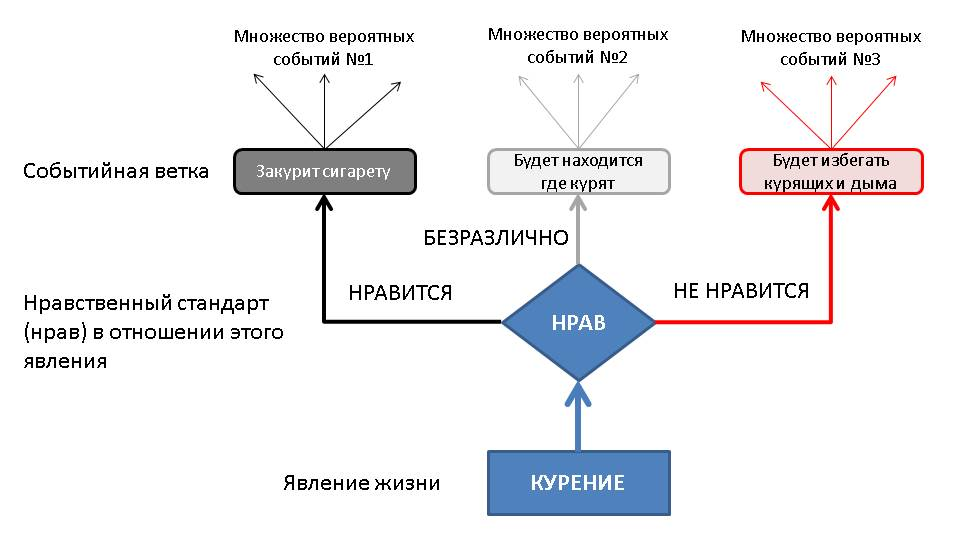 Когда в психике происходит обработка поступающей информации, (а обработка — это некий алгоритм), то промежуточные результаты обработки сопоставляются с жизненными установками самого человека, которые и записаны в нравственности. И сопоставление начинается с наиболее приоритетных нравов — вниз к менее приоритетным, пока не будет найдено соответствие.