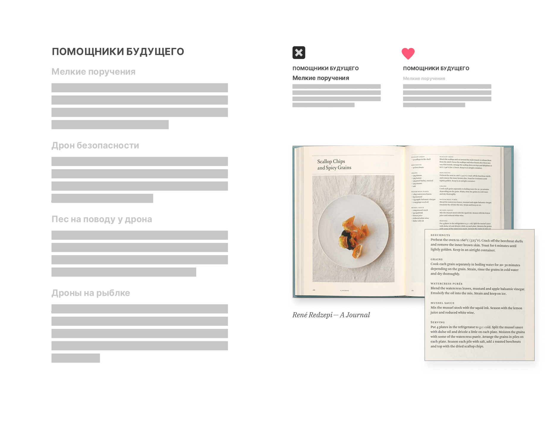 Важно соблюдать иерархию, чтобы подзаголовки не перекрикивали заголовок. Иначе информацию воспринимать будет неудобно