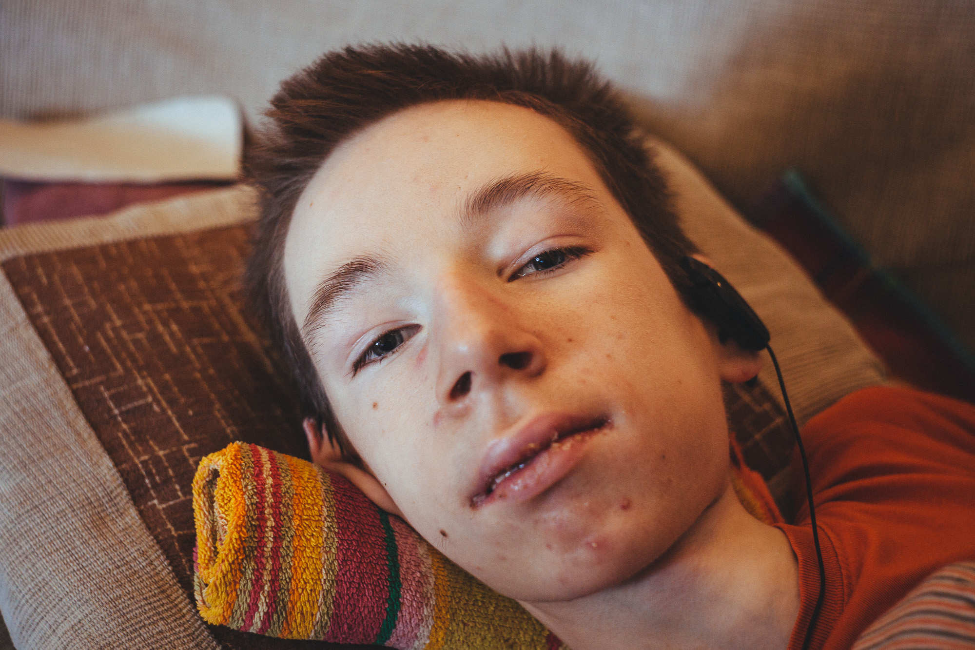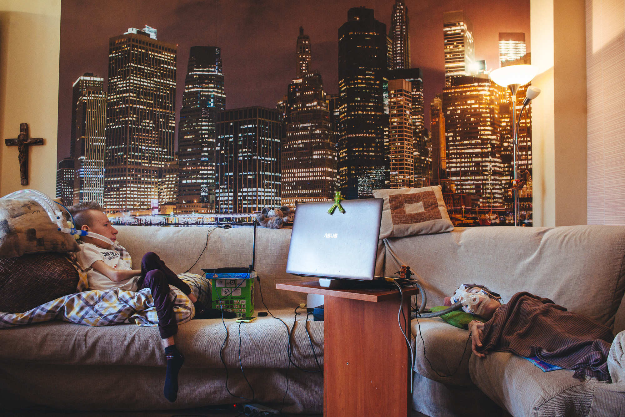 Парни никогда не стояли на своих ногах, но еще не так давно могли рисовать и писать. Теперь Богдан двигает только глазами, а полноценно дышать ему помогает специальный аппарат. У Матвея двигается один палец, он может недолго сидеть без опоры.