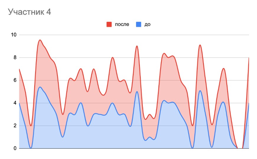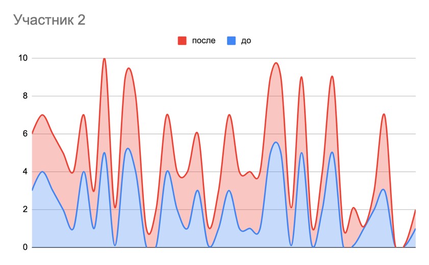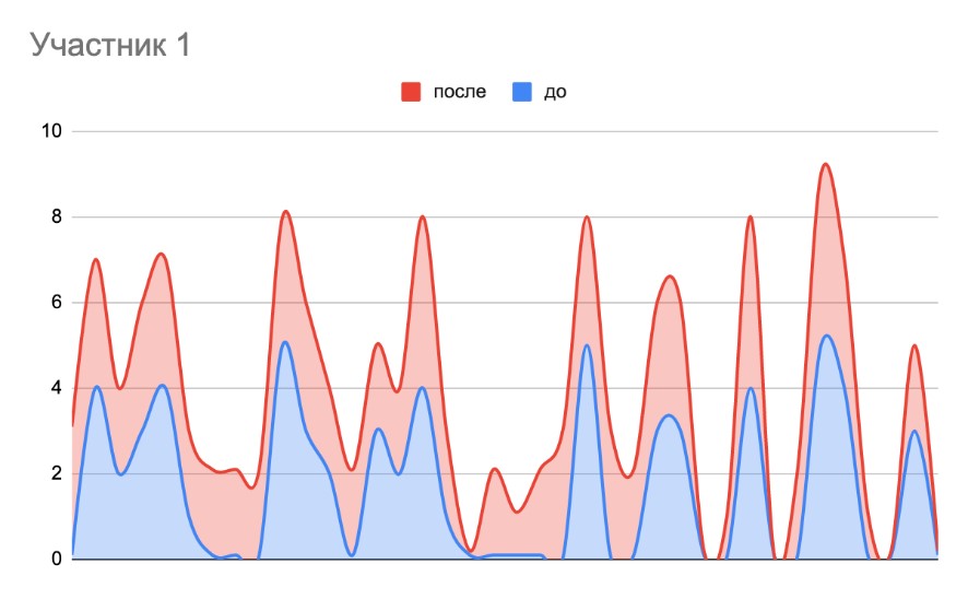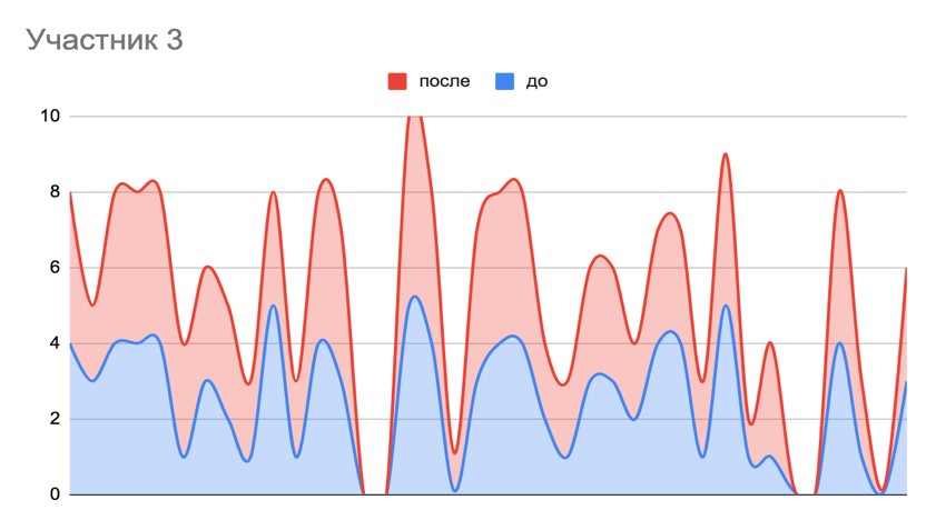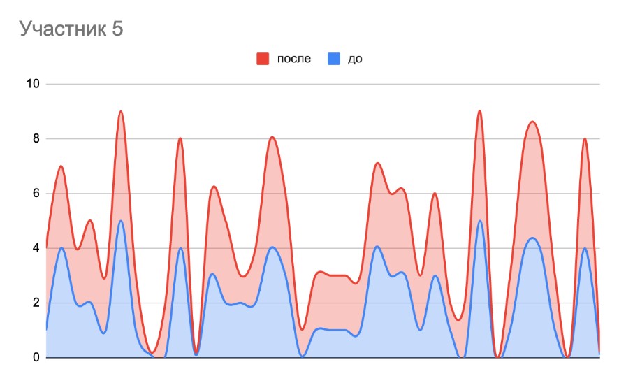 Однозначно можно сказать о динамике репертуара движений, двигательной активности, пространственной ориентации и невербальных кинестетических коммуникаций в процессе танцевальной терапии. по методике телесного анализа Н.Ю. Оганесян. Наглядно представлено на диаграмме по каждому участнику: