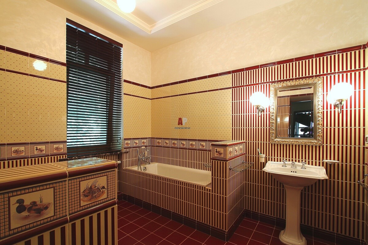 Классическим вариантом отделки стен и полов является дерево благородных пород: мореный дуб, темный орех, красное дерево. В качестве альтернативы для отделки стен можно использовать панели, декорированные «под дерево», для пола – керамическую плитку с имитацией этого натурального материала. Керамическая плитка представляет собой оптимальный вариант для отделки полов в ванной, прихожей, кухне. Здесь принято использовать мелкоформатную октагональную плитку со вставками контрастного цвета. Истинный Английский стиль невозможно представить без обоев в широкую полоску темно зеленого или красного цветов. Как правило, нижняя часть стен оформляется деревом, а верхняя выклеивается обоями. Среди других материалов необходимо отметить текстиль. Добротные ткани, такие как шерсть, шелк, бархат, хлопок, лен и другие играют важную роль в декорировании интерьера. Для отделки мебели используется натуральная кожа.