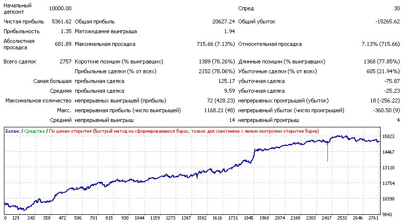 Система имеет 78.06% прибыльных сделок со средней прибылью 9.59$ и средним убытком -25,23$.