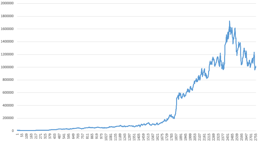 Наш депозит показал пик на отметке 1 724 000, а затем мы попали в серию неудачных сделок, что снизило наш баланс до 997 000.
