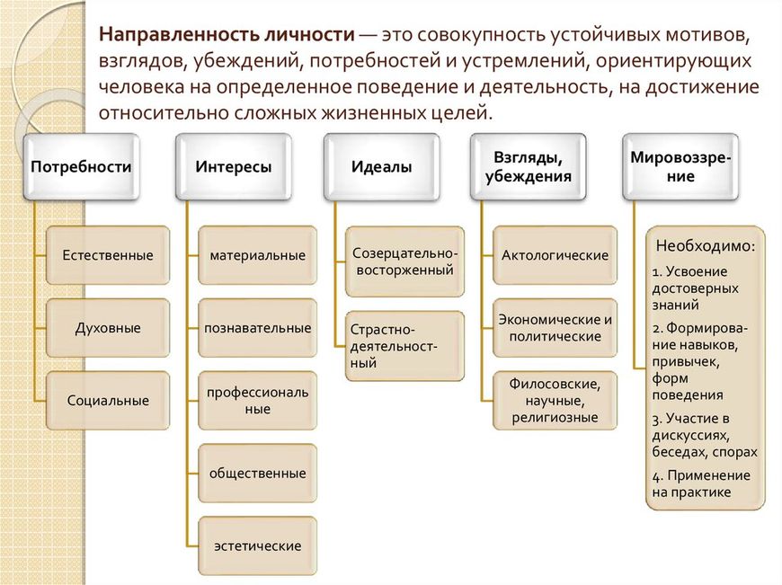 Под направленностью личности понимаются потребности, желания, убеждения, мотивы и интересы человека, а также его идеалы и ценностные ориентации