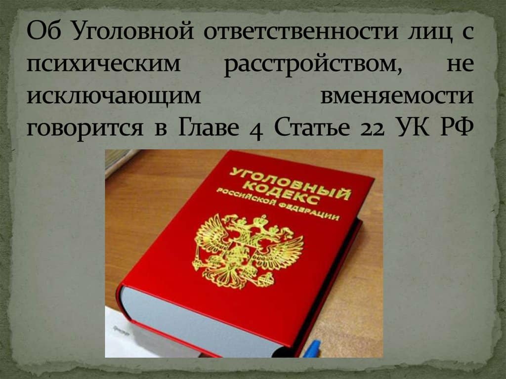 Мои читатели наверняка удивятся, что закон не содержит такого понятия, как «вменяемость», а выводится его значение непосредственно через обратную категорию – «невменяемость». Под невменяемостью в УК РФ расценивается состояние лица, выражающееся в неспособности понять и руководствоваться личными действиями под воздействием различных факторов, характеризующих душевное состояние обвиняемого.