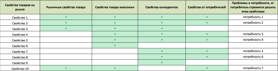 | Свойства от потребителей | Такие характеристики продукта, которые являются важными для вашей целевой аудитории и определяют их выбор (конечно, этот список лучше получить с помощью опроса целевой аудитории; но если нет на это времени и денег, то его можно составить на основе экспертного мнения сотрудников отдела продаж, вас и экспертов рынка) |
