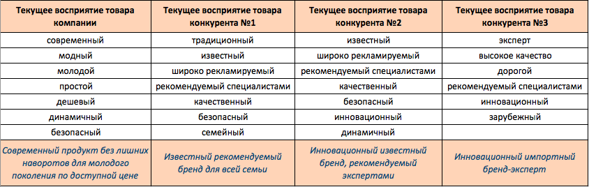 В конце попробуйте обобщить все названные определения в одно предложение, которое и будет представлять текущее позиционирование товаров на рынке.