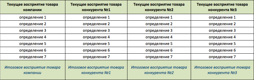 Таблица 1.1 Определение текущего восприятия товара и конкурентов на целевом рынке