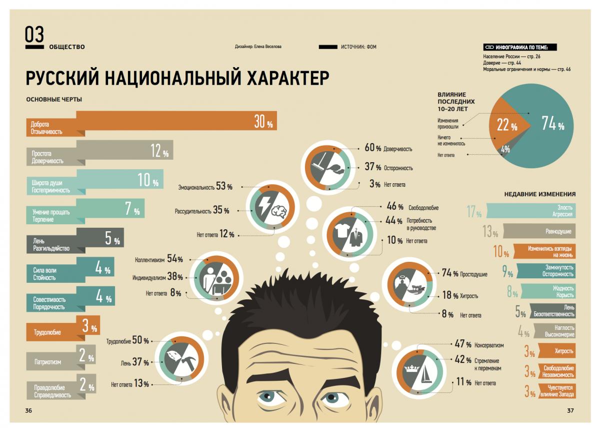- большая культура (литература, музыка, театр), развитие науки, способность достичь лучших результатов (совершенства) во многих областях, наличие современных технологий — и незаконченность, неспособность видеть последствия своих поступков заранее и планировать их, половинчатость, неумение и нежелание доводить до конца начатое дело – все решается на ходу, большинство учреждений работает на грани своих возможностей (почта, городcкой транспорт) (из этого вытекающие положительные черты характера — „находчивость“, „приспособляемость“, „умение создавать что-то из ничего“).