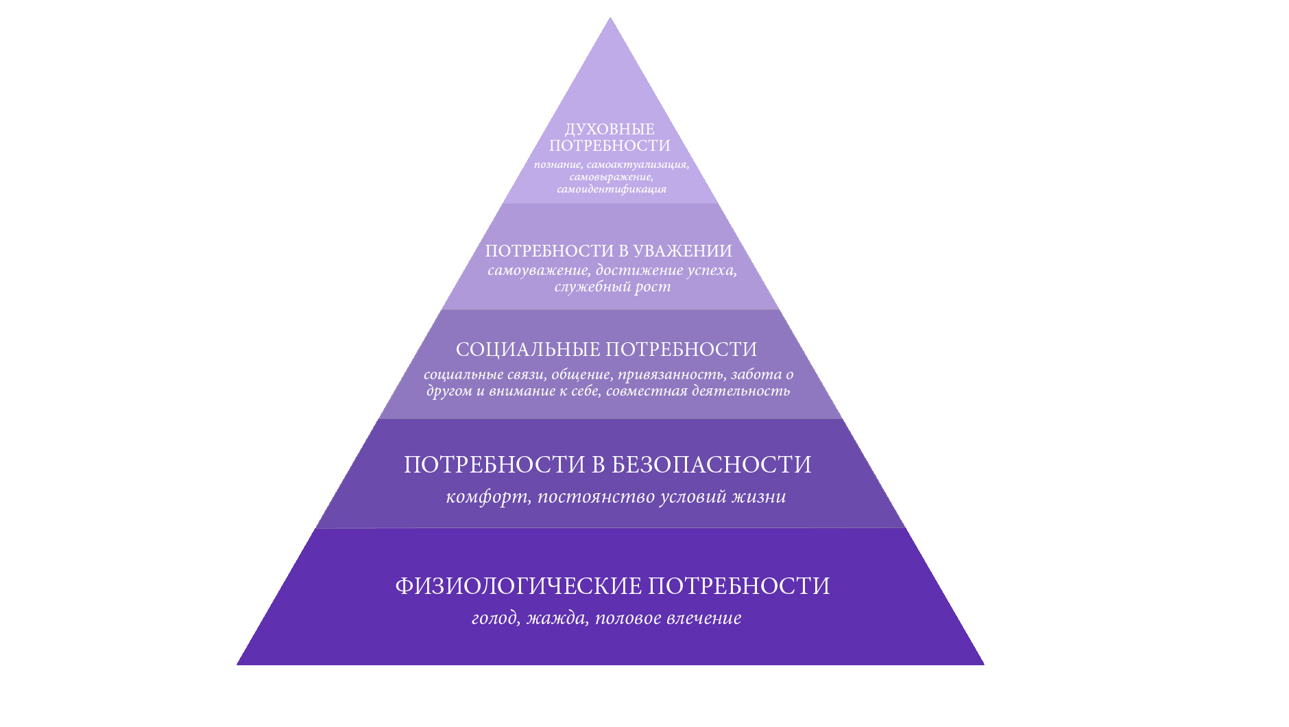 Мотивы напрямую связаны с потребностями человека, которые имеют определённую очерёдность. Это хорошо иллюстрирует «пирамида Маслоу», названная в честь её создателя-психолога.