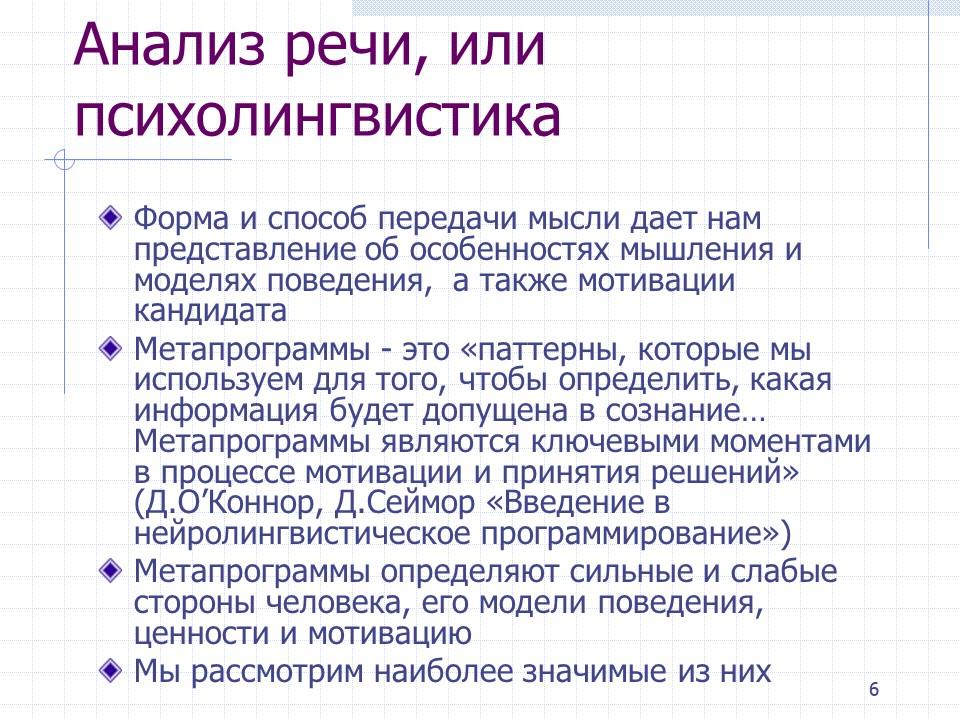 Метапрограммы – составная часть анализа речи, или психолингвистики (раздела науки, который изучает связь речи с психологией).