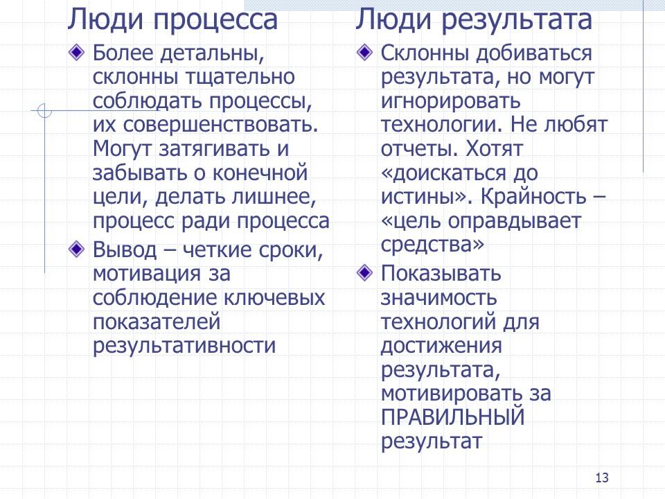 Люди процесса детальны, тщательны: любят соблюдать порядок и шлифовать процесс. Могут затягивать время и забывать о конечной цели.