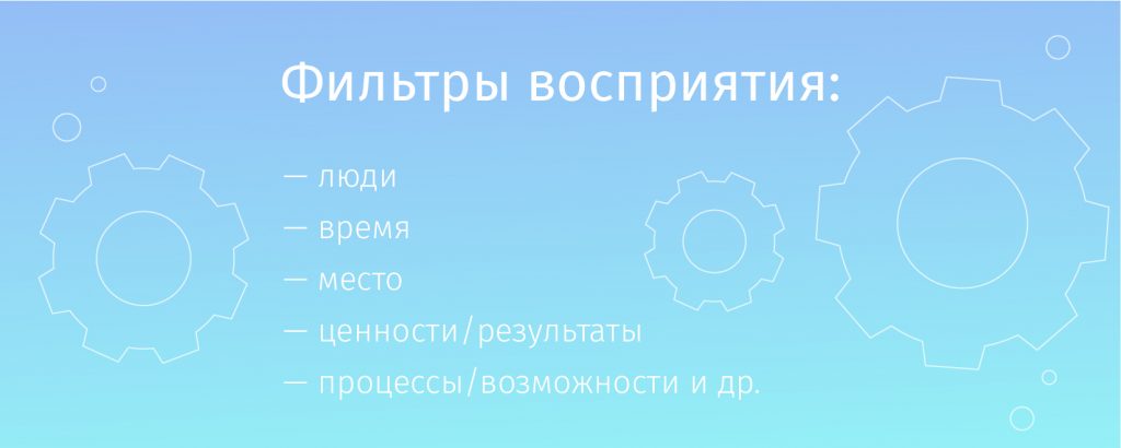 Фильтры «люди», «время», «место» являются очень простыми, отвечают на вопрос «кто?», «когда?», «где?». Фильтры восприятия «ценности/результаты» отвечают на вопрос «зачем мы это делаем?»