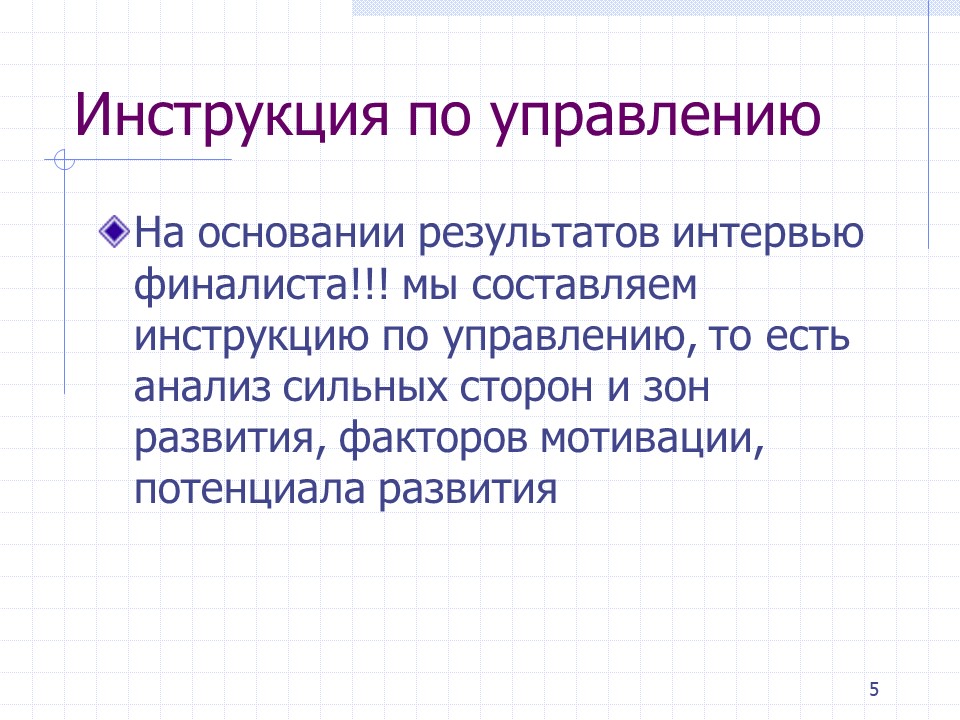 На основании результатов интервью лучшего работника, финалиста (не всех подряд) мы составляем инструкцию по управлению. Эта инструкция нам пригодится для себя, если берем человека себе в подчинение, или для заказчика, если мы HR.