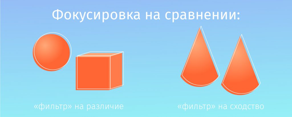 Мы всегда сравниваем с чем-то поступающую информацию, чтобы отнести ее к какой-то области нашего опыта, или сопоставляем с чем-то известным или абсолютно новым. Таким образом, мы всегда находим сходство (с чем-то, что напоминает нам прошлый опыт) или различие (чем отличается от известного нам опыта).
